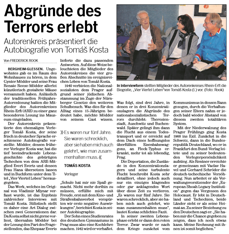 stellt seine frisch in deutscher Sprache erschienene Biographie vor. Nach Naziterror in Theresienstadt, Auschwitz und Buchenwald erlebte er in Prag den kommunistischen Terror. Als Emigrant wurde er in Deutschland im Kreis von Heinrich Böll, Carola Stern, Günter Grass, Willy Brandt und PEN-Club ein erfolgreicher Verleger. Als Rentner erreichte er gemeinsam mit Vaclav Havel und Gerhard Schröder die deutsch-tschechische Versöhnung, und nun arbeitet er als Verwaltungsratsvor-sitzender des European Shoah Legacy Institute (Theresienstadt und Prag) gegen das Vergessen des Holocaust.